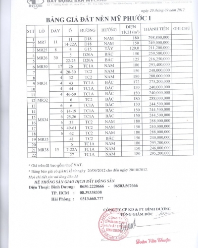 Bảng giá đất ná»n Dá»± án Mỹ Phước 01