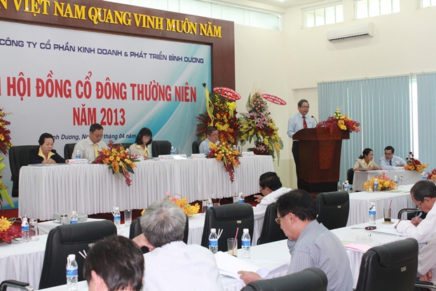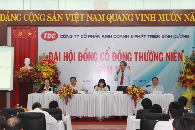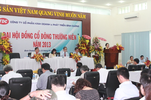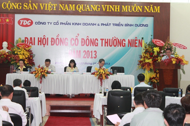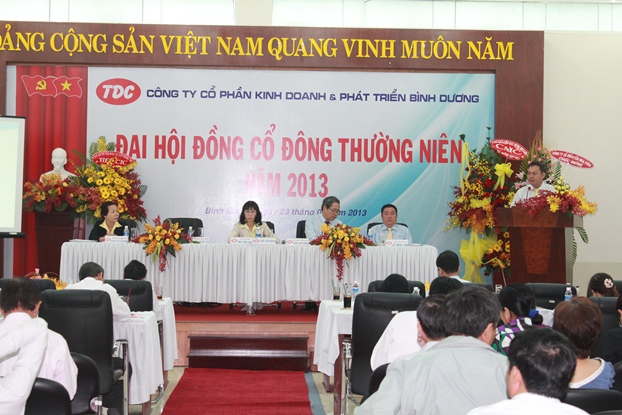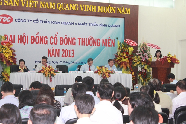 Ngày 23/4/2013, tại Há»™i trưá»ng Công ty Cổ phần Kinh doanh và Phát triển Bình Dương, địa chỉ số 26-27, lô I, đưá»ng Äồng Khởi, phưá»ng Hòa Phú, thành phố Thá»§ Dầu Má»™t, tỉnh Bình Dương, Công ty Cổ phần Kinh doanh và Phát triển Bình Dương (TDC) Ä‘ã tổ chức Äại há»™i đồng Cổ Ä‘ông thưá»ng niên năm 2013.